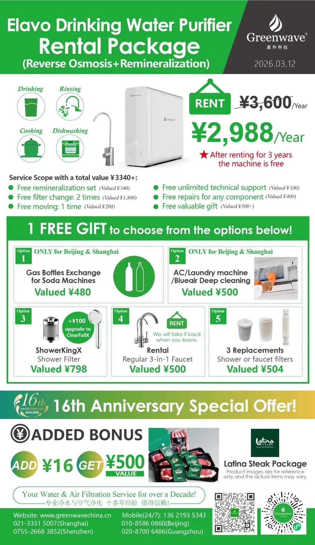 想参与Elavo 16周年租赁福利?欢迎直接联系Greenwave,告诉我们:您所在城市 + 家里用水情况,我们会帮您快速判断最合适的方案,并协助选择礼物(包含¥16加购Latina牛排礼盒)。数量有限,先到先得。