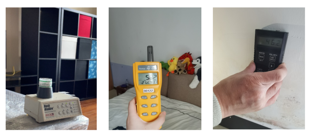 Mold Investigation Kits: (from left to right) Buck BioAireTM Sampling Pump, Allergenco-DTM cassette, Moisture Meter & Temp/RH Meter