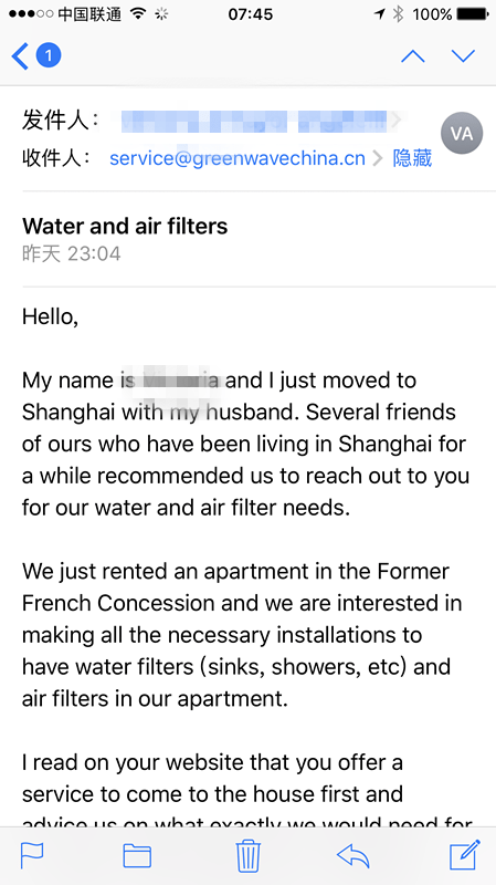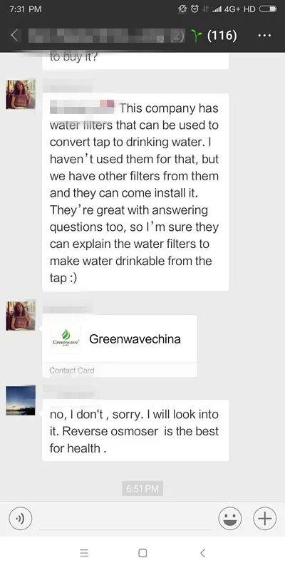 我们一位在北京某汽车业的客户分享过她的类似经历,在认识我们之前她找到的都是存在操作和服务沟通问题的滤水品牌。直到通过一位同事的介绍找到我们,她才从Greenwave得到了满意和愉快的体验。