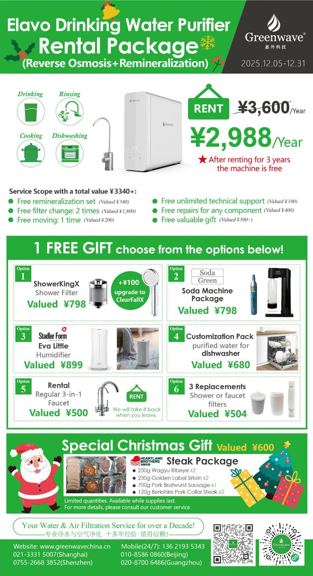 您是否在考虑使用Greenwave净水产品或直饮水机租赁服务?又或许您是我们的现有用户,平时定期更换滤芯?自今日起至2025年12月31日,在现在的折扣之外,您将额外享用一份价值600元的礼物!(商用客户与空气净化器相关的业务不在本次活动之内)